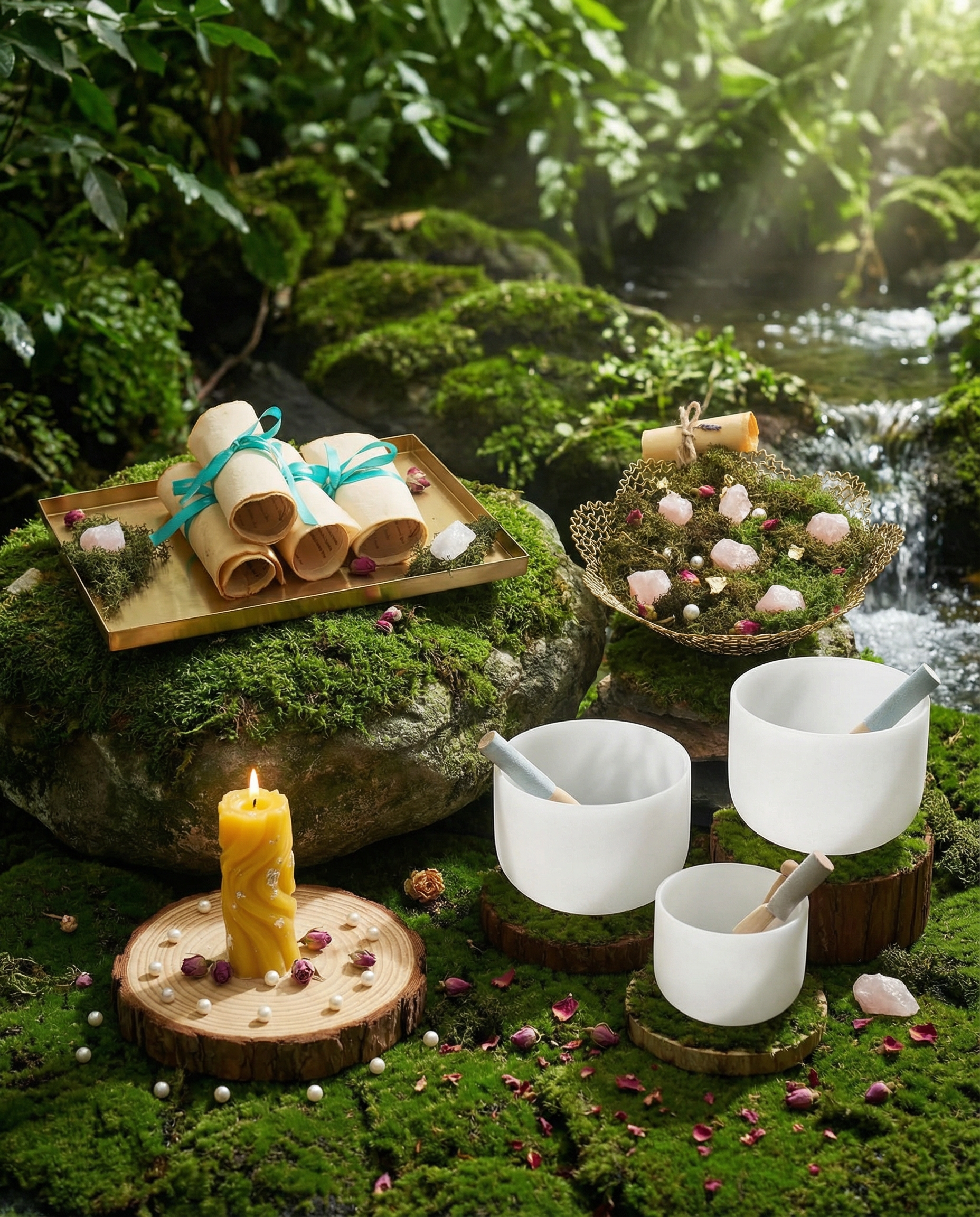 Presented in gold satin wrapping and paired with a hand-poured beeswax candle flecked with gold, the offering is designed for contemplative ritual and quiet illumination.